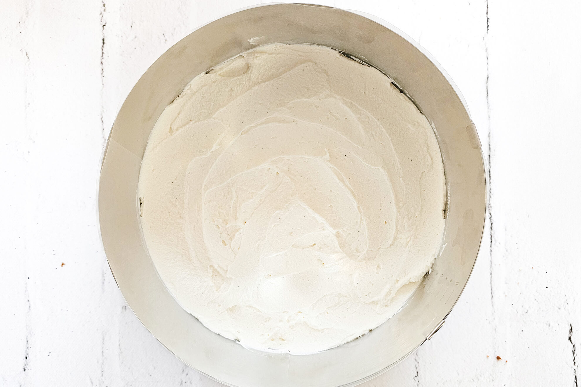 Einstreichen: Tortenring und Folie entfernen, restliche Mascarponecreme glatt rühren und gleichmäßig auf Oberfläche und Rand verstreichen. Glätten oder sanfte Wellen ziehen, anschließend 30 Minuten kaltstellen.