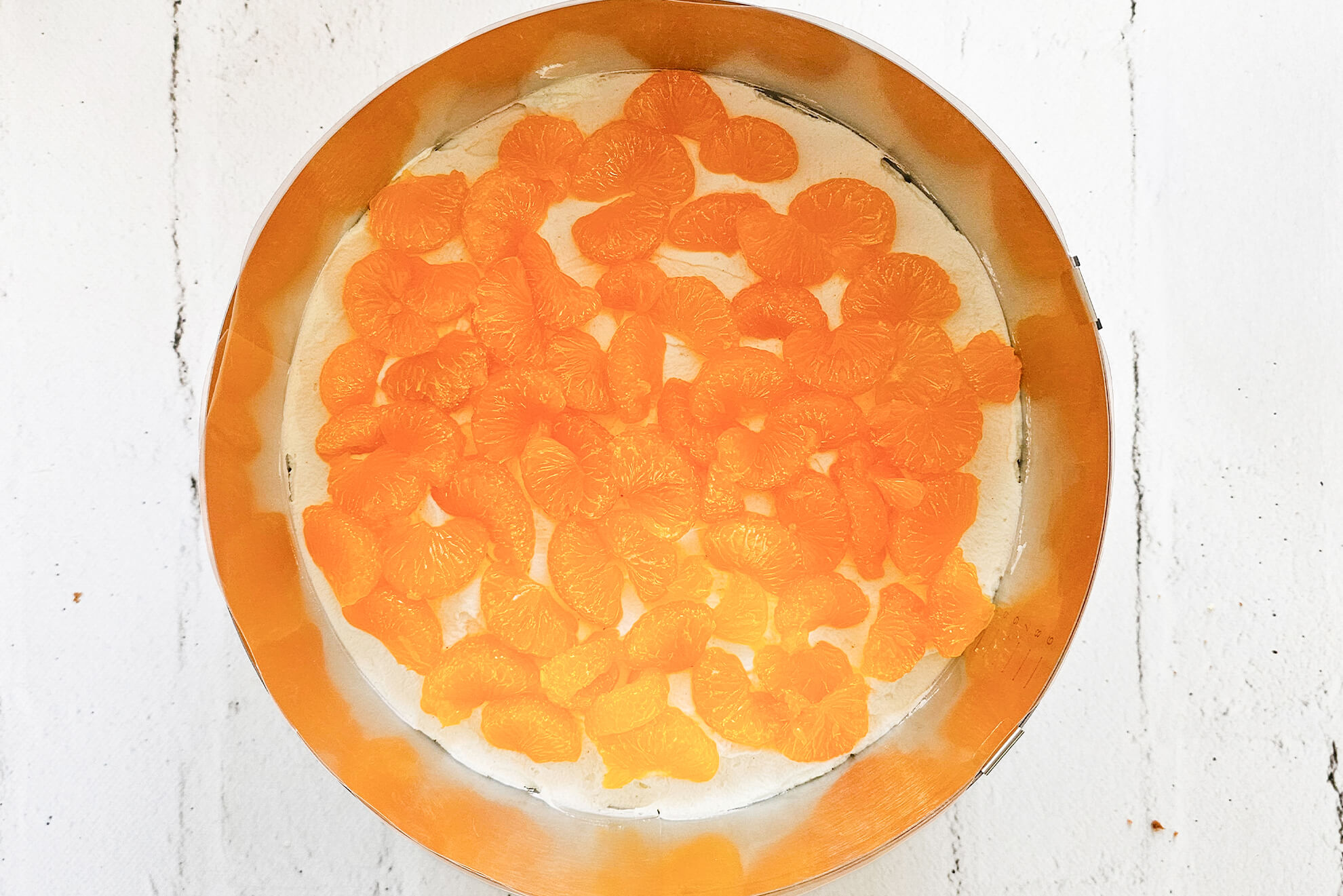Gieße die restlichen Mandarinen gut ab und lass sie ein paar Minuten im Sieb stehen, damit kein Saft mehr auf der Oberfläche der Torte verläuft. Verteile die Früchte anschließend dicht an dicht in Kreisen auf der gekühlten Torte – beginnend am Rand und nach innen leicht überlappend.