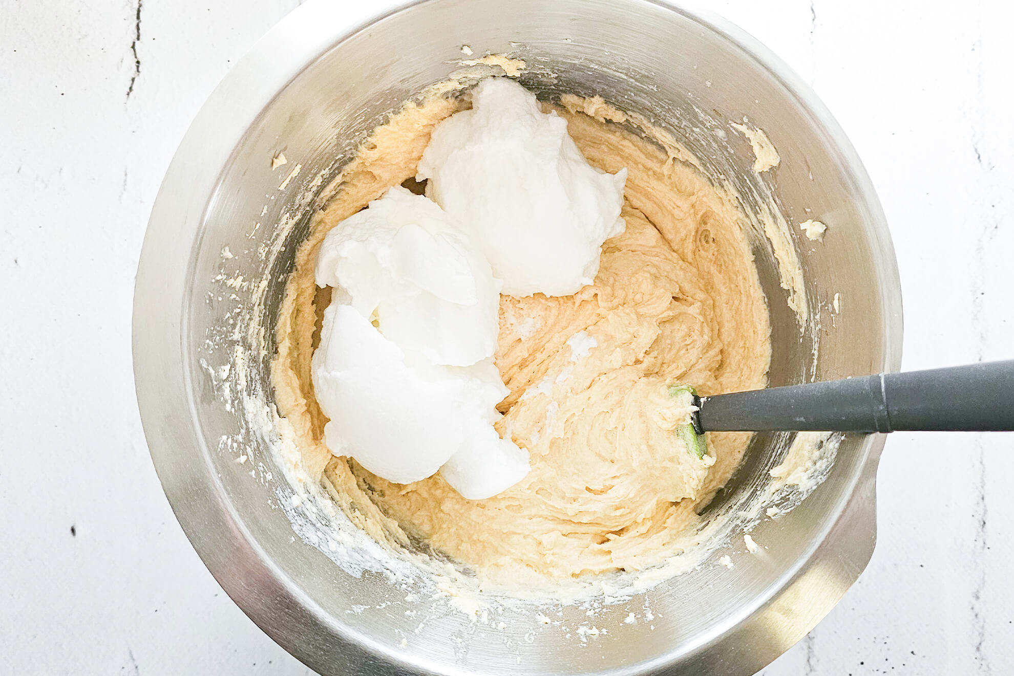 Wenn der Teig gleichmäßig cremig ist, rührst du ein Drittel des Eischnees kurz ein, um ihn aufzulockern. Den restlichen Eischnee hebst du dann vorsichtig mit einem Teigschaber unter – von unten nach oben, damit die Luft im Teig bleibt und er später schön locker wird.