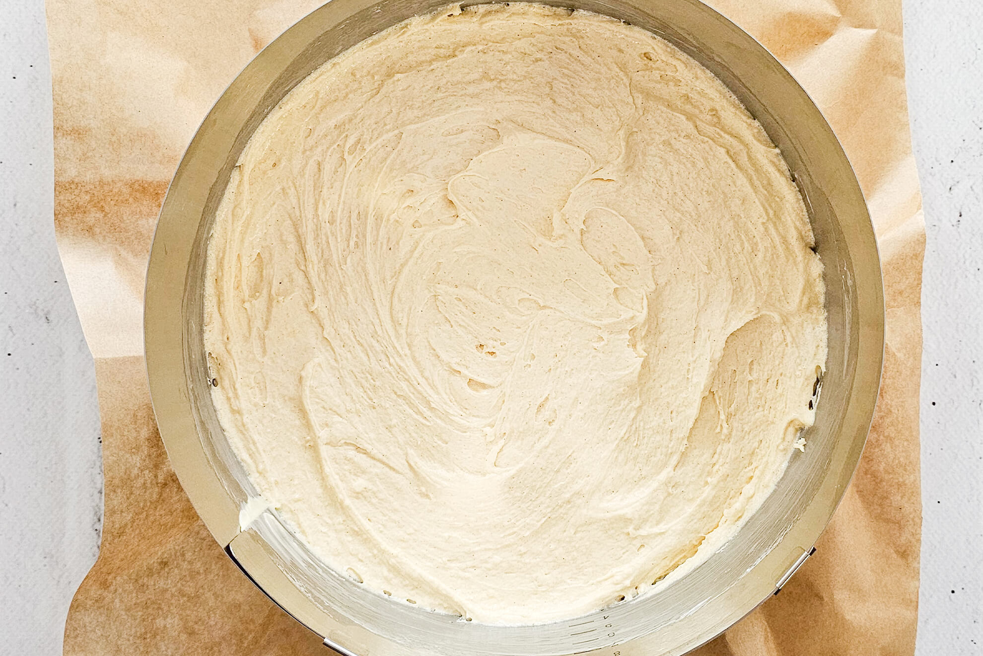 Der Teig sollte hell, luftig und weich vom Löffel fließen. Fülle ihn gleichmäßig in die vorbereitete Springform und streiche die Oberfläche glatt.