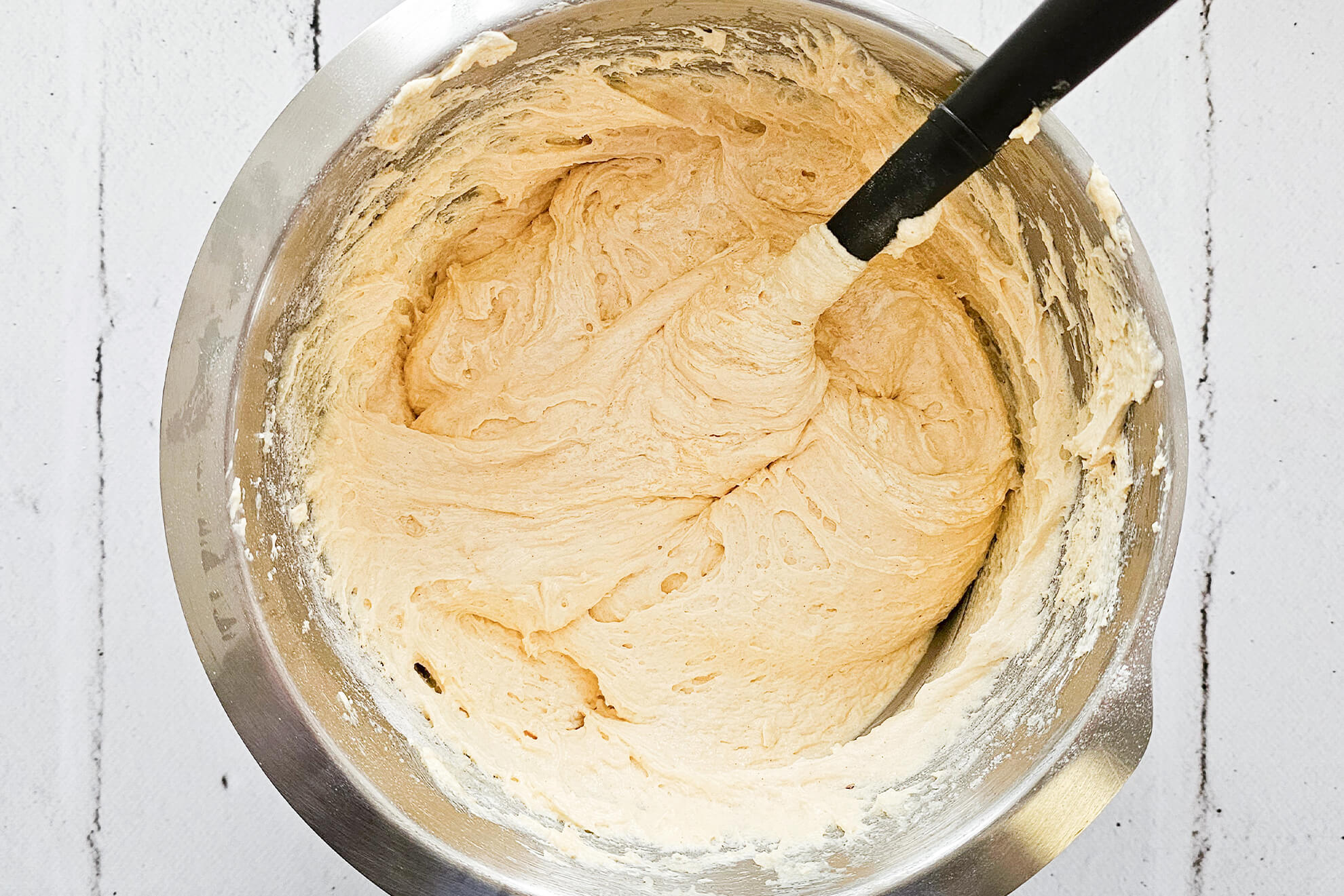 Wenn du magst, kannst du zwischendurch mit dem Teigschaber am Schüsselrand entlangfahren, damit sich keine Butterreste absetzen. Die Butter-Zucker-Mischung sollte am Ende fast weißlich aussehen – das ist das Zeichen, dass genügend Luft eingerührt wurde.