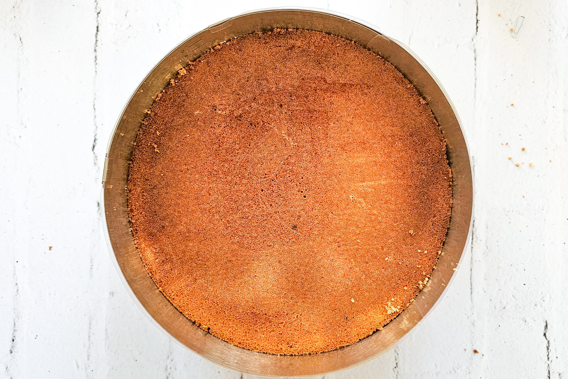 Schiebe die Form auf die mittlere Schiene des vorgeheizten Ofens und backe den Boden bei 180 °C Ober-/Unterhitze etwa 50 bis 55 Minuten. Der Teig sollte goldbraun aufgehen und in der Mitte bei der Stäbchenprobe sauber bleiben.
