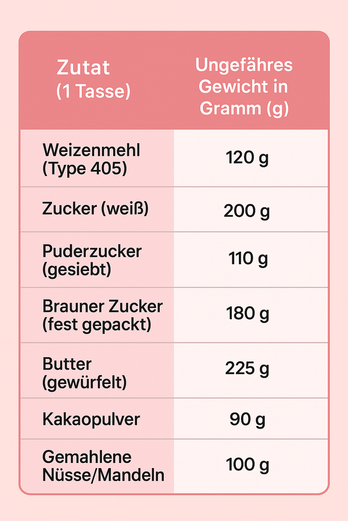 Natürlich gibt es sie: die geliebten alten Familienrezepte oder tolle Rezepte von internationalen Blogs, die nur Tassen-Angaben haben. Für diese Notfälle haben wir hier einen kleinen Spickzettel für dich erstellt. Aber denk dran: Das sind immer nur Näherungswerte!